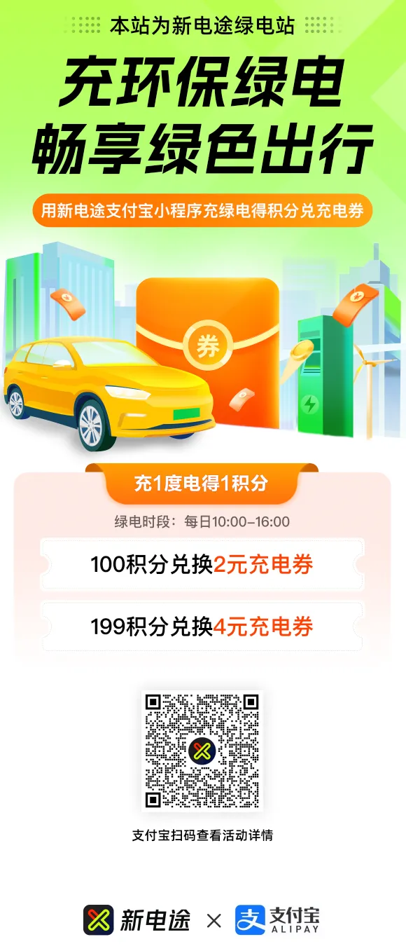 新电途同步推出了一项特别活动:从2024年7月11日至2024年9月11日,新能源车主在支付宝搜索“新电途”小程序,选择绿电电站充电即可获得绿电积分。这些积分可以直接兑换为新电途的充电权益,让车主在为环保贡献力量的同时,降低自身的充电成本。希望新能源车主,可以将绿电充电变成新日常、新时尚、新方式,新电途愿意陪每位新能源车主共同创造低碳、可持续的生活方式。